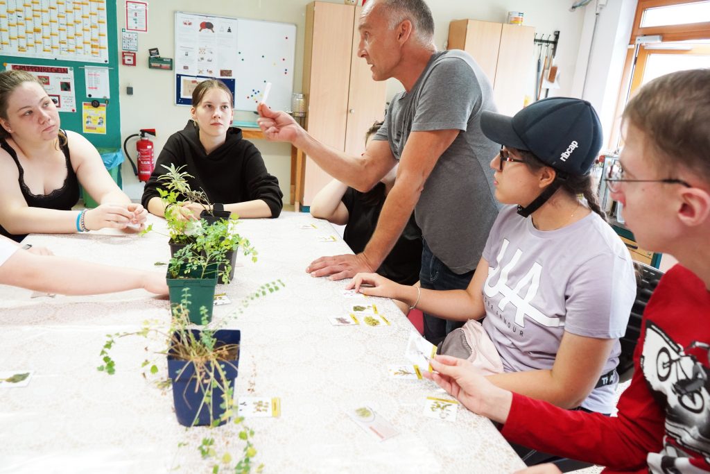 Nachdem das kurze 15-minütige Lehrvideo nochmal angesehen wurde, versucht Christian Jaria erneut, wichtiges Wissen bei den Teilnehmenden abzurufen. Wenn auch nicht perfekt, klappt es jetzt deutlich besser. Um das Wissen besser zu verankern, basteln alle ein Memory. Dazu werden Druckvorlagen einzelner Kräuter samt Bild ausgeschnitten. Während das einigen ganz leicht fällt, brauchen andere Unterstützung beim Halten und Benutzen der Schere. Alle Papierschnipsel werden nun zwischen zwei Folienblätter geklemmt und laminiert. Danach muss alles erneut zurechtgeschnitten werden. Hier ist Ausdauer und Konzentration gefragt. Für manche eine echte Herausforderung. Doch irgendwann ist es geschafft: das Memory ist fertig. Aus dem heimischen Garten hat Herr Jaria Kräutertöpfchen mitgebracht, darunter verschiedene Sorten Salbei und Thymian. Können die Teilnehmenden die Kärtchen zu den richtigen Pflanzen zuordnen? Einige Schülerinnen und Schüler sind ratlos: Das Bild des Salbeis auf dem Kärtchen passt nicht 100-prozentig zu der Pflanze, die in der Mitte des Tisches auf ihre Bestimmung wartet. Herr Jarias Kollege, Gruppenleiter Thomas Ninnemann, ermutigt, die Pflanze mit allen Sinnen zu entdecken. Wie fühlt sie sich an, nach was fühlt sie sich an, nach was riecht oder schmeckt sie? Während einige sich unangenehm an Medizin erinnert fühlen, schwärmen andere von Halslutschtabletten oder Tees. Klar, das ist Salbei! Auf diese Art und Weise wird auch der Thymian schnell ausgemacht. Hier sind die Assoziationen deutlich freundlicher: Nudeln mit Tomatensoße und Pizza. Lecker! Doch ins Klassenzimmer sind nicht nur Salbei und Thymian umgezogen, auch Schnittlauch und Pimpinelle hat Christian Jaria aus dem Garten mitgebracht. Nach und nach werden so wichtige Kräuter vorgestellt und theoretisch wie auch praktisch neues Wissen aufgebaut und gefestigt. Diese Kombination, die gleichen Informationen mit verschiedenen Sinnen und in verschiedenen didaktischen Methoden zu erschließen und zu wiederholen, hat die besten Aussichten auf den angestrebten Lernerfolg. Verschiedene Hirnareale werden so aktiviert und am Lernprozess beteiligt.